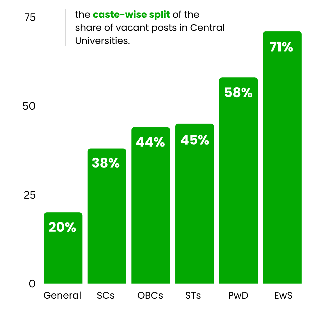 Reservation: The reservation of teaching posts also adds to the phenomenon. This could be because of two reasons: either not enough candidates from the reserved categories are applying for the posts, or the universities can’t find deserving candidates. Here’s the visualisation of the data: