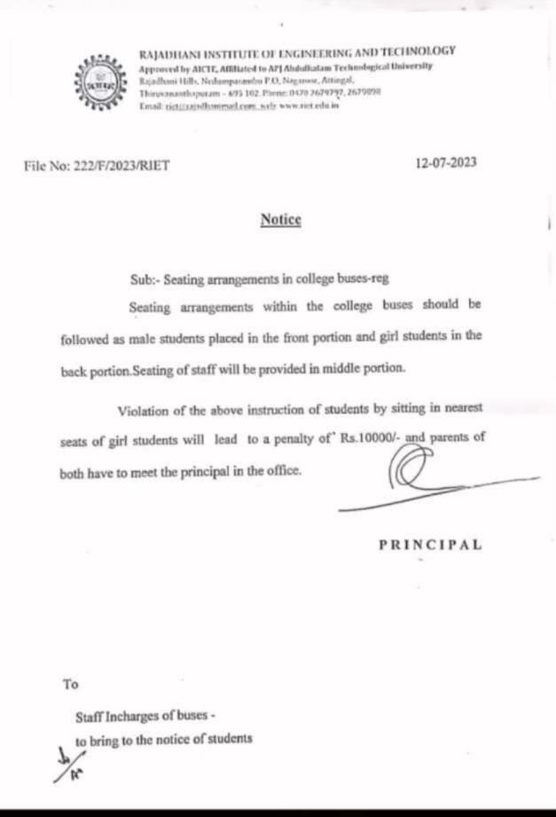 This circular was issued by the Rajadhani Institute of Engineering and Technology, Thiruvananthapuram, Kerala. It asked the boys and girls to sit separately in the college buses. It also directed the boys to sit in the front portion and the girls in the back, with the seats in the middle reserved for the staff. Moreover, a fine of Rs. 10,000 would be imposed on boys if they’re found sitting next to girls.