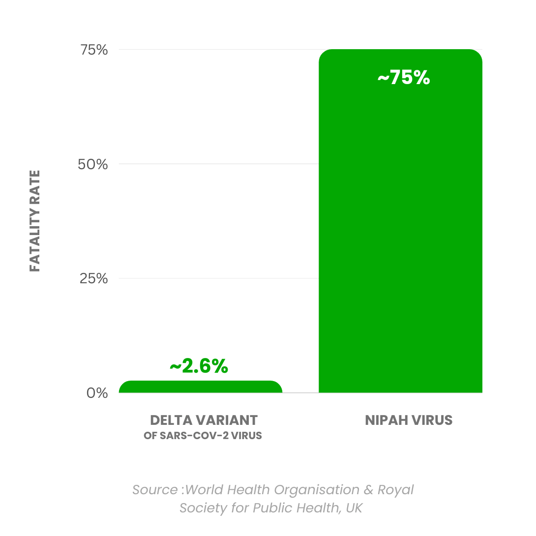 This chart compares the fatality rate of the Delta variant of SARS-CoV-2 and Nipah virus. The fatality rate measures the severity of the disease that causes death. Say 200 people are diagnosed with a disease. If 20 out of those 200 people die, the disease's fatality rate is 10%.